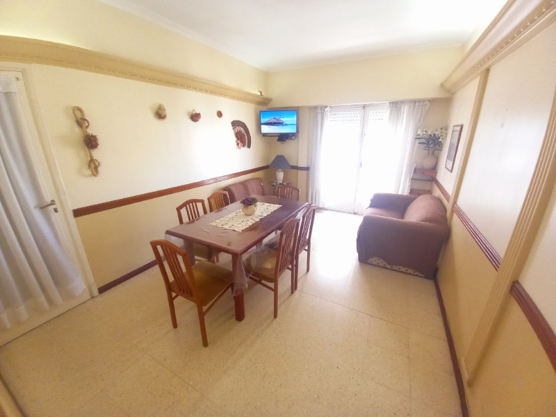 Departamento de 3 ambientes con balcon saliente corrido, desde living-comedor, LCD con WIFI y Direc tv prepago, segundo balcon saliente, cocina con lavadero con lavarropas separado, dormitorio principal con cama matrimonial, segundo dormitorio con cama cucheta marinera y otra cama de 1 plaza (4 camas de 1 plaza) Baño completo y baño toillet.
